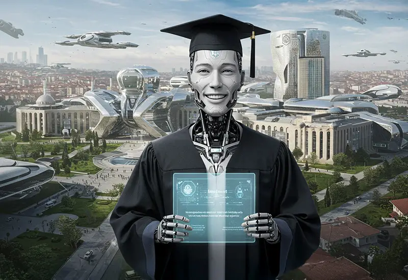 Google Image/Fx tarafindan üretilen bir resim örnegi:”2255 yllinda Istanbul’daki Ozyegin Üniversitesi önünde diplomasi ile duran bir robot mezun”